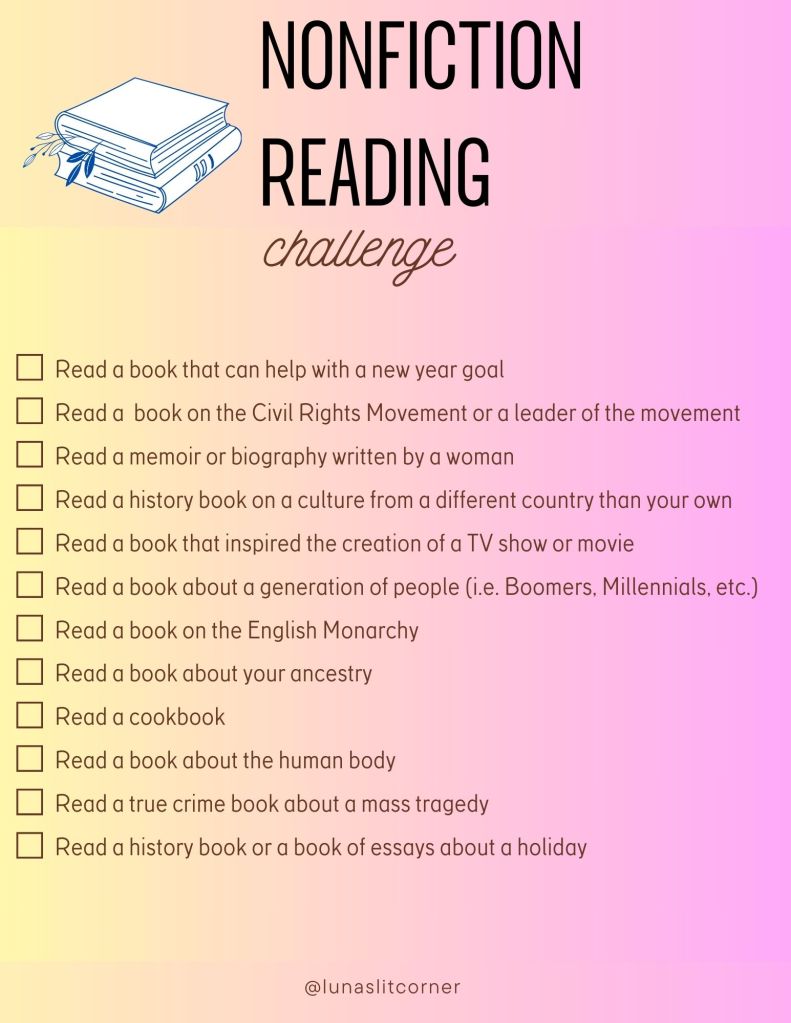 Another challenge I will complete is a nonfiction one. I created it for my husband to complete, and I wanted to share it with you all as well.